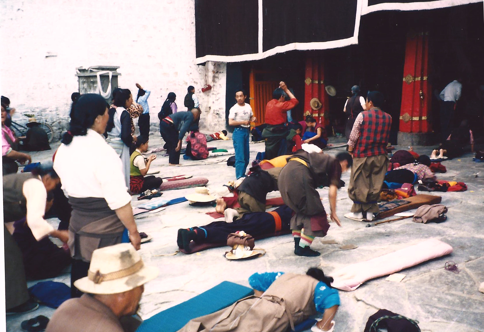 I am sitting at the outer courtyard of the Jokhang, as I have been most evenings here in Lhasa. There is the usual crowd of people doing their prostrations. I recognize many of the faces by now, and they recognize me. They all have their spots, and I have mine too – on the steps, to the right. The two women who are always place their mats to the right, against the wall are done for the day. As they leave, they touch me on the shoulder. We exchange tashi delek’s and one of them hands me a piece of candied sugarcane with a smile. The man with the battered felt hat who sits to my left must have known I was leaving. In gestures and broken English he wishes me well and tells me to come back again. When I nod my head, he whispers yakpo, yakpo du! He answers kale phe to my kale shu. Up there on the left is the old lady who always badgers me to do the prostrations with her. She didn’t badger me today. She held my hand and talked. I have no need to know the language to know what she said. I am going to miss this; miss these people with their big smiles and open hearts.