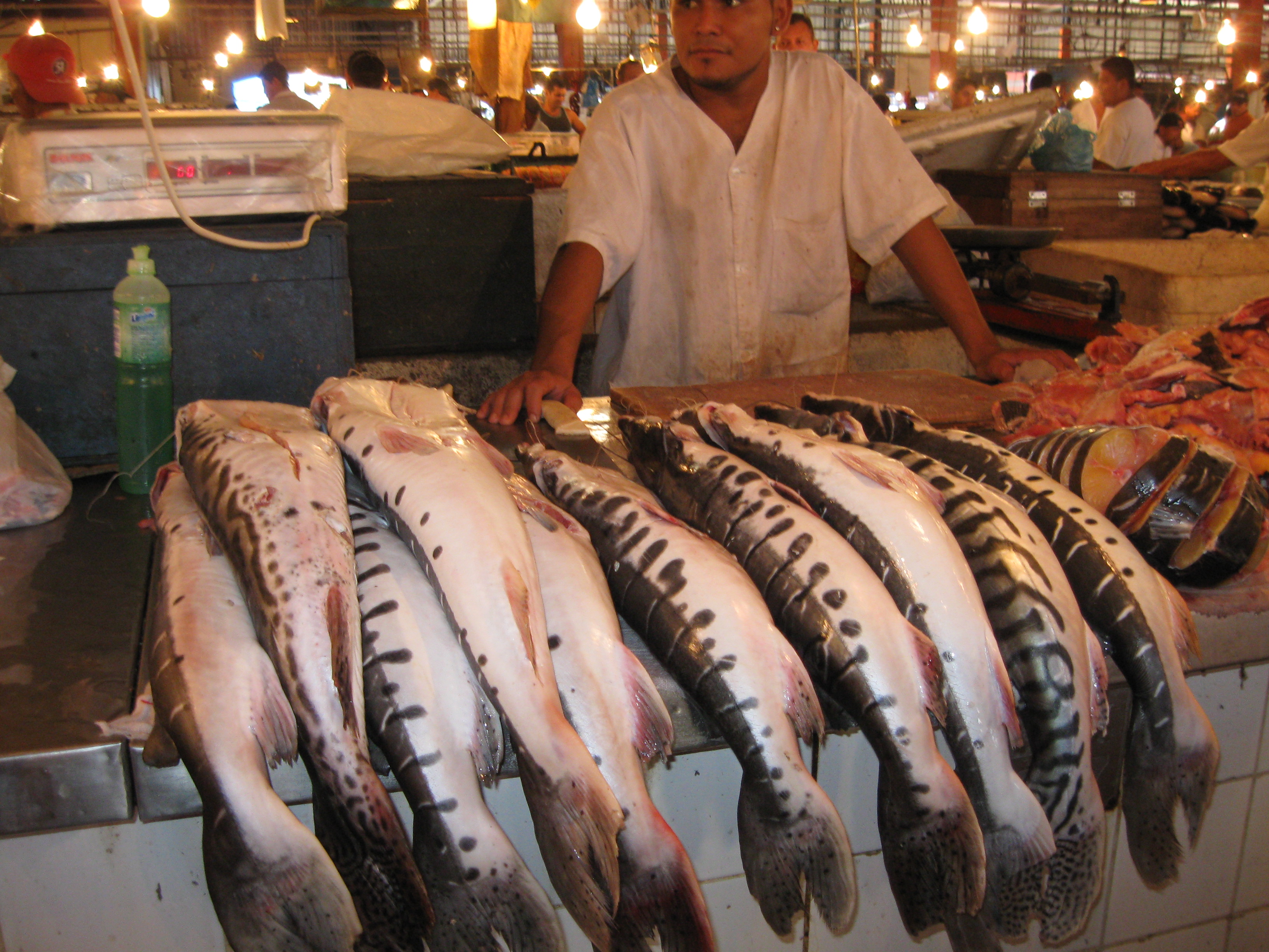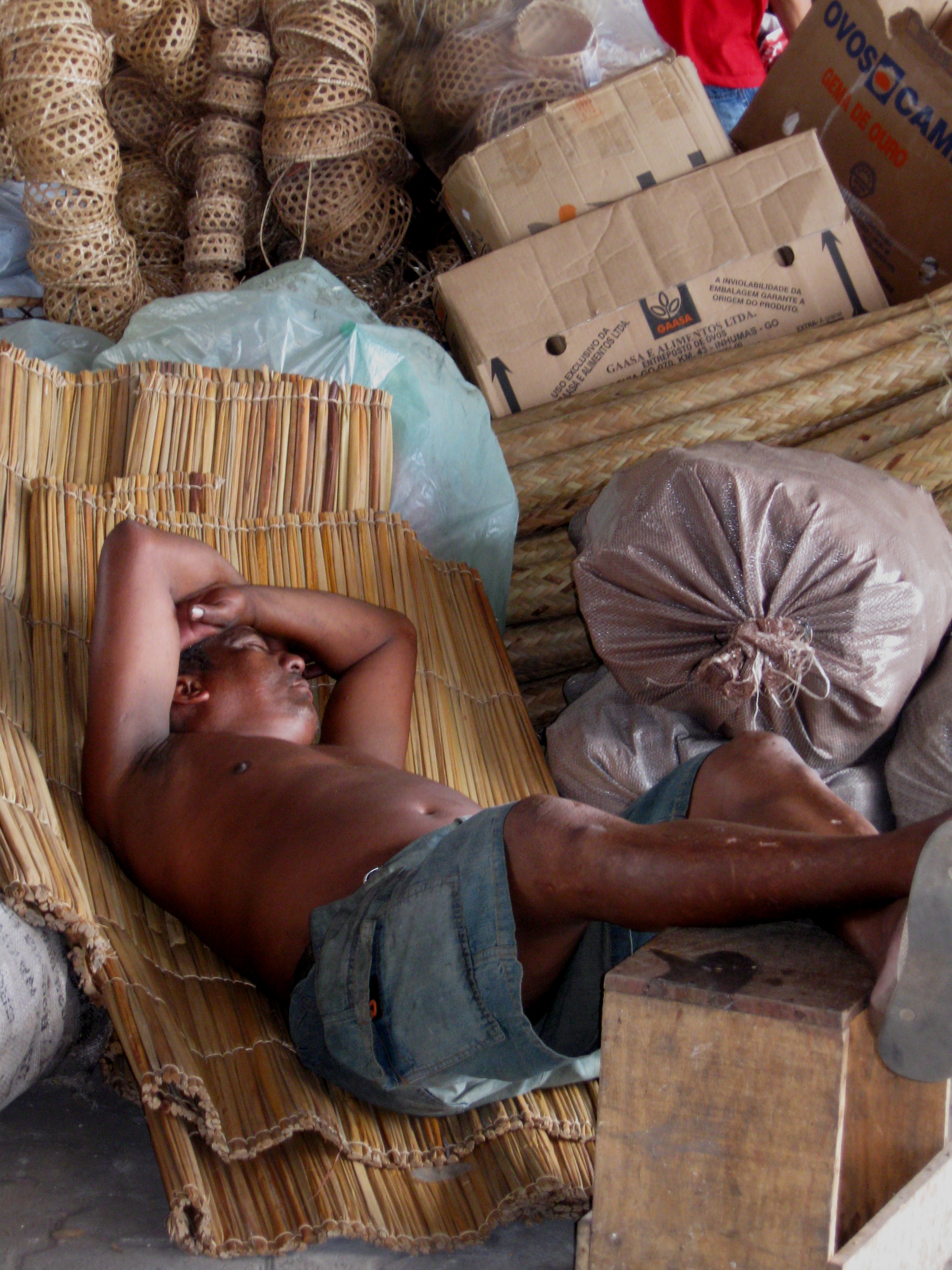 The market in Belem is the usual chaotic sprawl with all manner of goods being bought and sold. There are large mounds of rice, flour, and other dry goods. The virulent smell of dried fish comes from one area where are rows of heaped baskets ranging from squid and shrimp to huge fish that I have no names for.