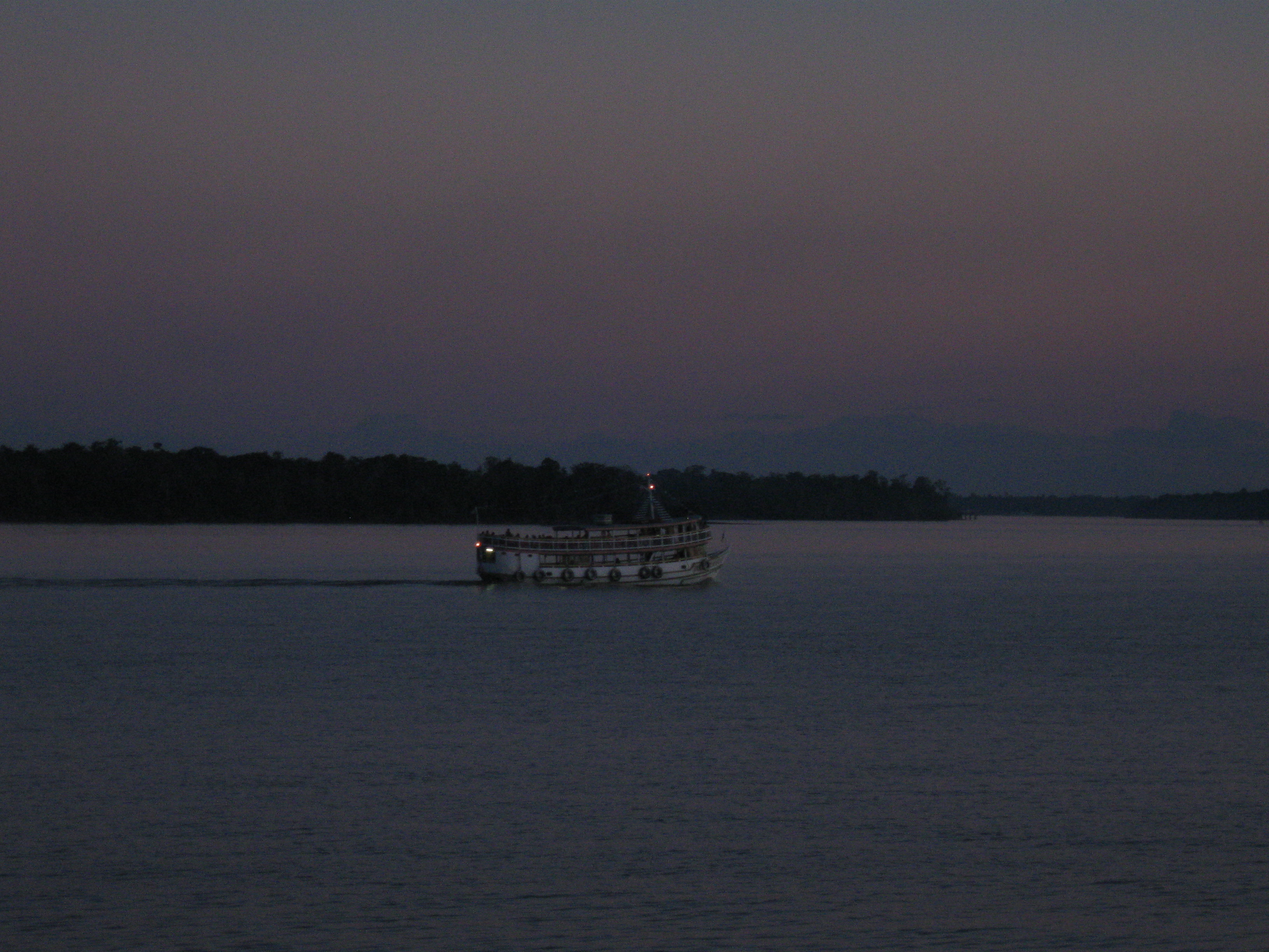 The Amazon so wide that it doesn’t even feel like a river. The light has almost faded and standing at the rail I see a hazy darkness on both sides with an occasional pinprick of distant light of a village on the shore.The air is humid but with the boat in motion there is a slight breeze.