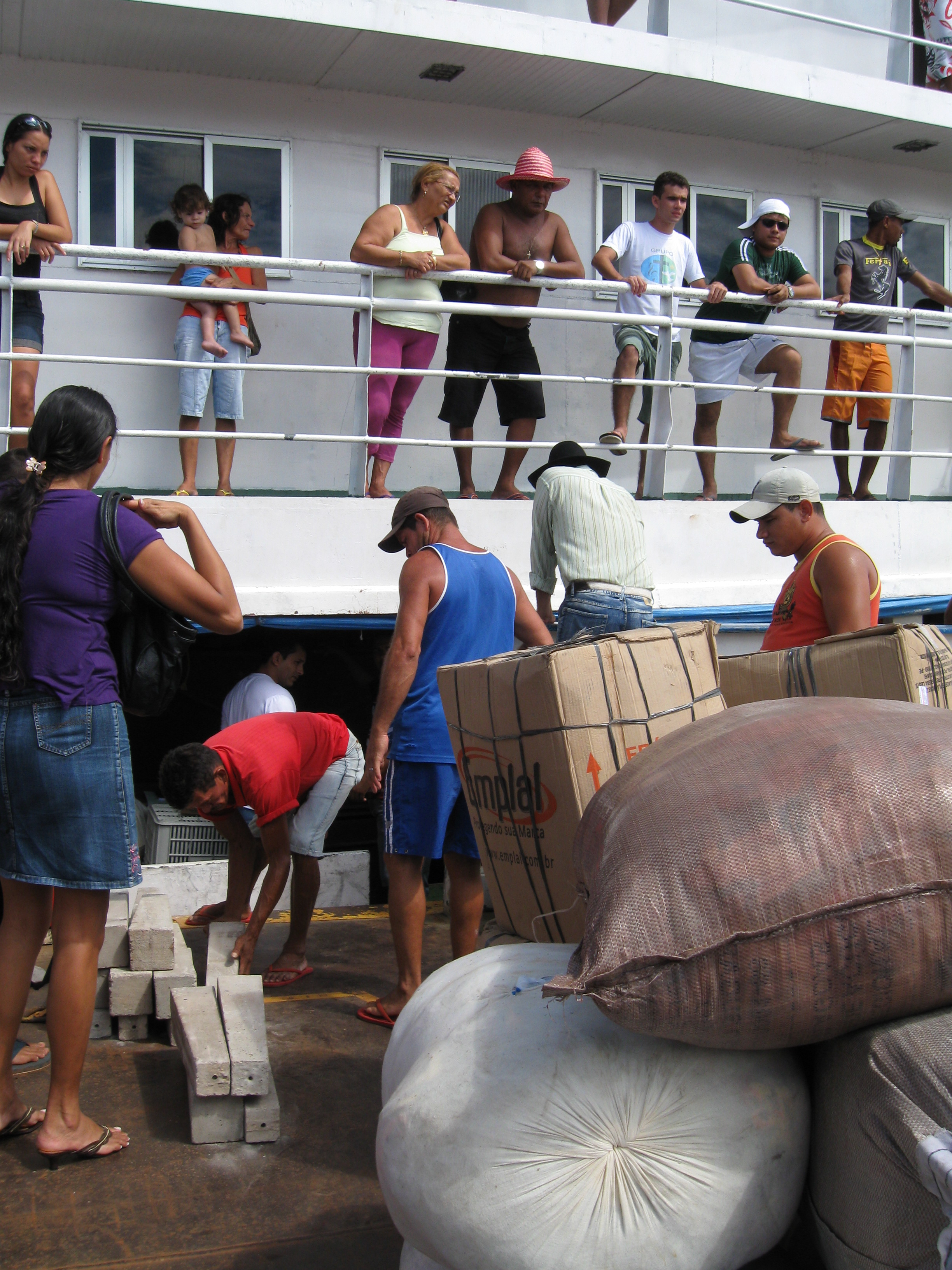 The loading area had been a hive of activity since early afternoon as the boat is loaded. The variety of goods ran the gamut from crates of eggs, a couple of bongo drums to a pet monkey to crates of fizzy drinks and sacks of flour, rice and potatoes. We were supposed to sail at 2 pm but that came and went as did 3 pm and 4. By six, the happy hour had metamorphosed into a party with copious amounts of cachaça being downed. As is the norm in these parts, someone started some music and all was well in this world.