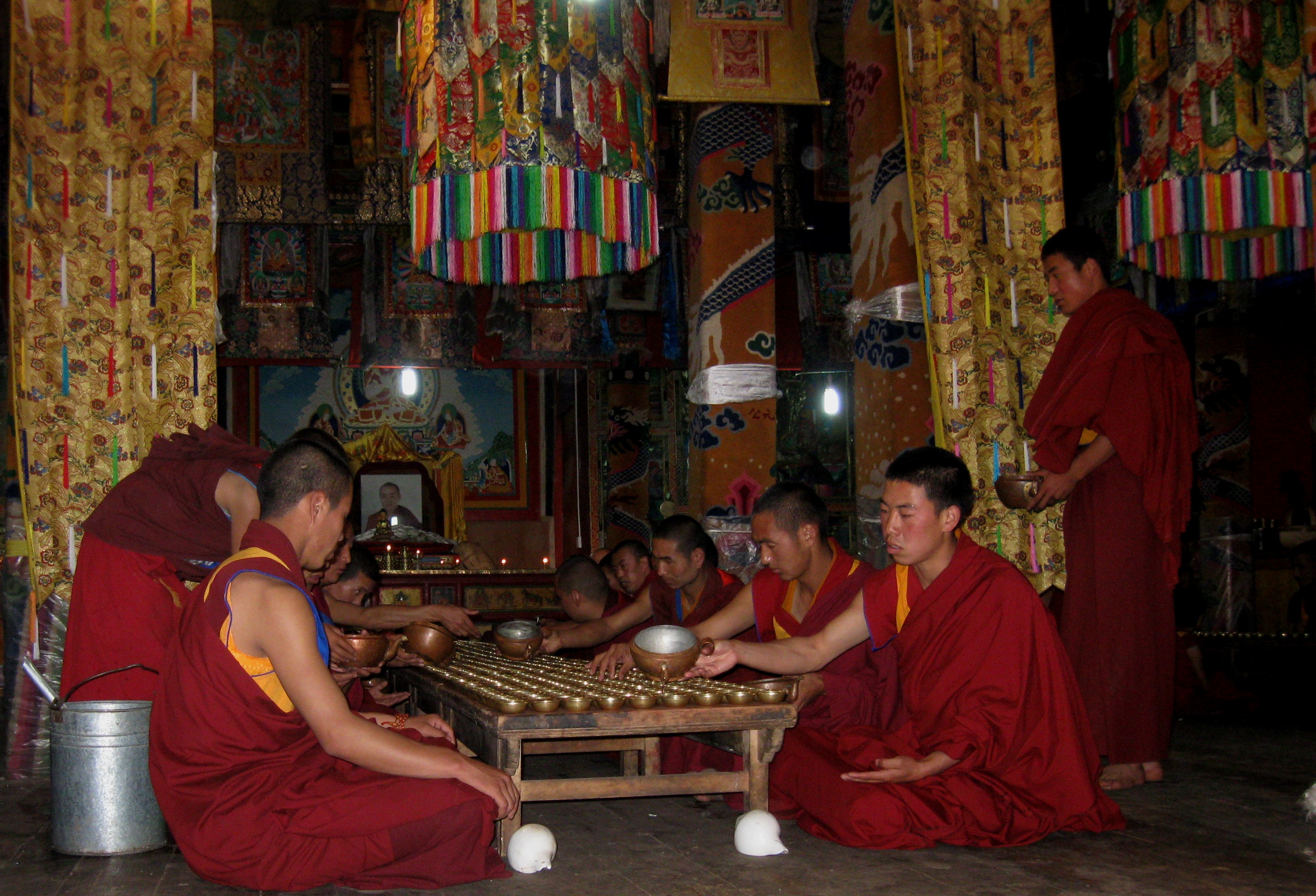 Monks robed in maroon with the tall yellow hats of the Gelugpa sect chanted prayers as the tendrils of incense curled into the air. Lit by the glow of yak butter lamps, the deities painted on the wall seemed to peer down on us. Young novice monks rushed back and forth with kettles of salt butter tea, refilling cups during the breaks. Prayer flags flapped in the breeze outside and the chanting drifted on the wind, reflecting off the walls of the canyon.