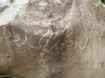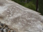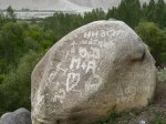 Langar has another attraction. The cliffs above the village is littered with boulders and many of these bear carvings from ancient times. We spent an afternoon scrambling around the mountain looking for these petroglyphs. Old images of ibex, cattle and human figures are overlaid by more recent graffiti in Cyrillic and Arabic. I recognized an old script from a book by Charles Allen read a while ago; it is similar to Prakrit, based on Sogdian. Judging by the number of coupled names, some adorned with hearts and flowers, this is an obvious ritual among young lovers in the area. And quaint in the way only one initial is used for each name.