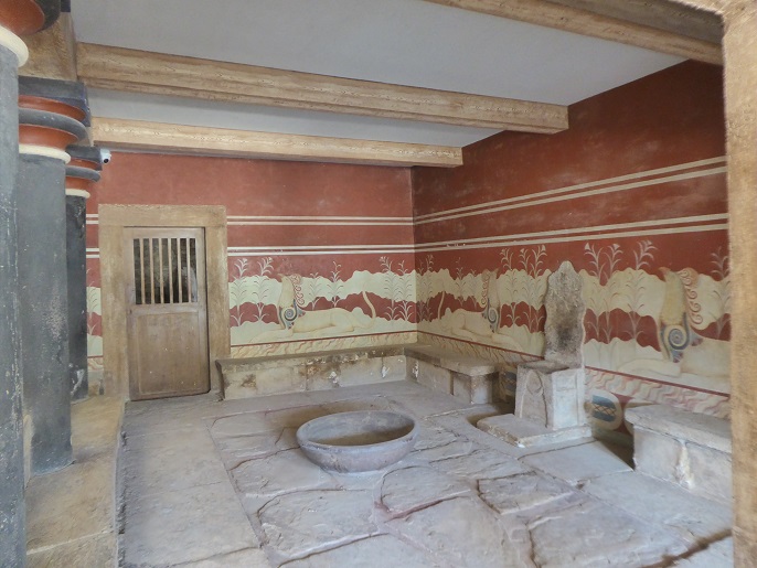 Immediately across to the west is the “Throne Room”. A small antechamber leads to openings through which I peer. The fancifully carved throne sits to one side with a large bowl set in the floor in front of it and all along the wall are the griffins against a red background. A narrow stone bench runs round around the perimeter, likely for exalted personages of the day. Across from the throne are black pillars and continuation of the bench. Somehow in photographs seen before, it had seemed much larger, more opulent and grander.