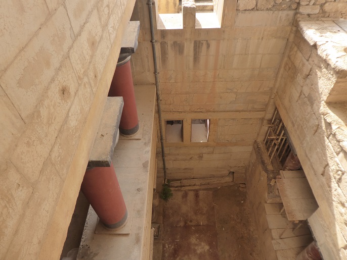 The middle of eastern side of the square is the entryway for the “Grand Staircase” that leads down a full four storeys. Two storeys down is the “Shield Room”, so called because of the figure of eight shields on the wall. These are faithful reproductions of the originals, now housed in the Museum. It is down these steps that the residential quarters are believed to be, including the Queen’s quarters where the famed “Dolphin” fresco was found. But sadly, these are closed now to the public, ostensibly for renovation although I saw not a single person, nor any signs of work actually being done.