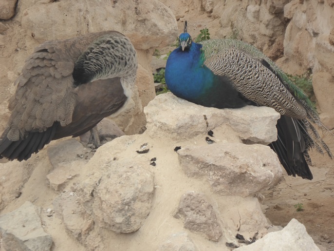 Entering from the west I see the three huge circular underground storage silos and then past the corridor of processions to the south end. And there! There is the first blood-red pillar. Of course, this has been re-painted to match the originals but somehow it brings to life what was. And there around the corner on the wall is a reproduction of the fresco of the “cup bearer”. The original in the Archeological Museum in Heraklion, is actually much finer than this reproduction. Up the wide stairs are three gigantic pithoi or jars, likely used for storage of grain and oil. Across them is a large underground storage chamber, meticulously divided into rectangular sections. The resident peacocks call it home these days.