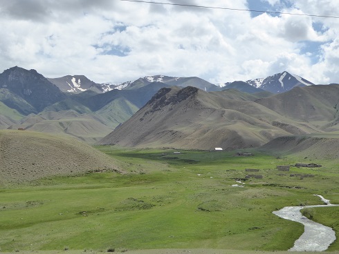 A quick lunch and pit stop and a a stop at the bazaar to buy some food stuffs and we headed out. The road out of Kochkor rose steadily and the air cooled. The road was asphalted for an hour or so but that stopped as we veered off to the west along a dirt road. On either side were stark hills with hardly any habitation. We were driving along a valley and rising toward the pass that lay high up. Toward the end of the valley were some houses – with corrugated tin roofs, they seemed spacious.