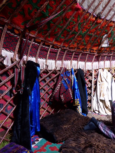 Similar to the Mongol and Kazakh gers from the outside that I remember from Mongolia, these were lavishly decorated inside. Around the inside walls, tied to the wooden poles were rugs made of felt called shyrdaks that is uniquely Kyrgyz. The wooden circle at the top,called tunduk to which the poles are slotted supports a woven mesh from which hung bright coloured tassles. Glitter is clearly highly favoured and appears in the threads and in form of sequins.